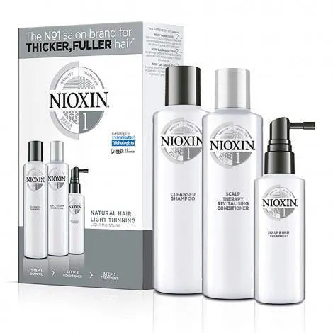 The Nioxin System 1 Trio Pack is a hair care set specially designed for normal to thin-looking, fine, natural hair that amplifies hair texture while refreshing the scalp and delivering a healthy shine.