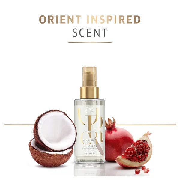 nfuse locks with smoothness and shine with Wella Professionals Oil Reflections Luminous Reflective Oil Light, an intensive treatment for fine to normal hair types. Suitable for use pre-shampoo, as a leave-in product or while styling, the weightless oil formula uses a potent blend of Macadamia, Avocado Oil and Vitamin E to smooth the hair cuticle and restore a luminous radiance.